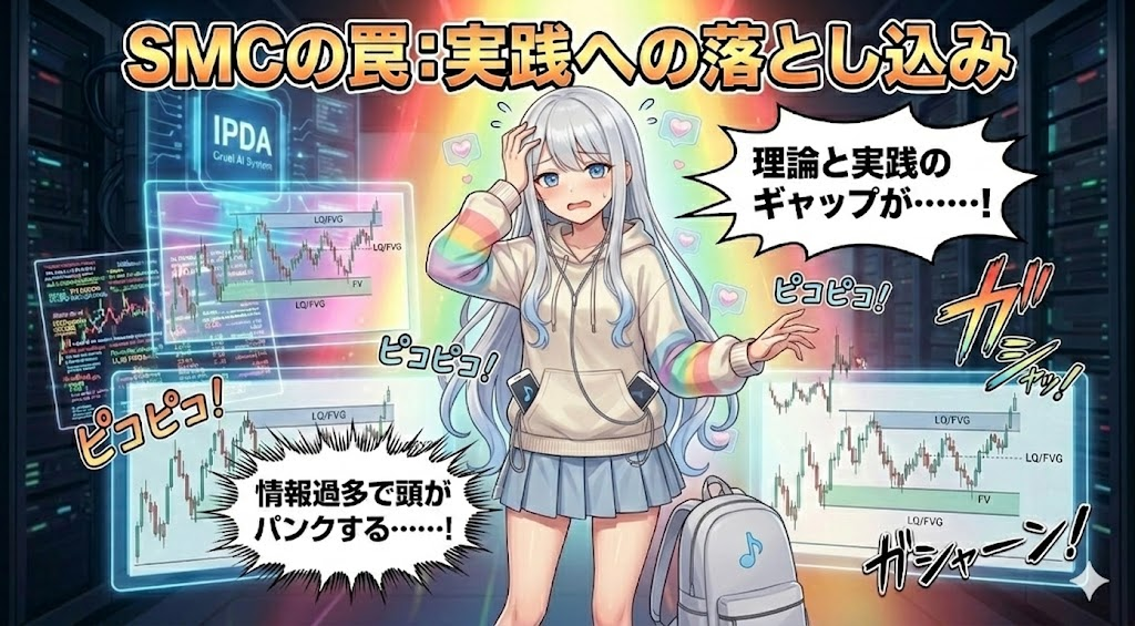 一般的な個人トレーダーが、分厚い辞書のようなSMCの理論をすべて理解して、実際の動いているチャートで瞬時に判断しようとすると、情報量が多すぎて途中で頭がパンクしてしまいます。